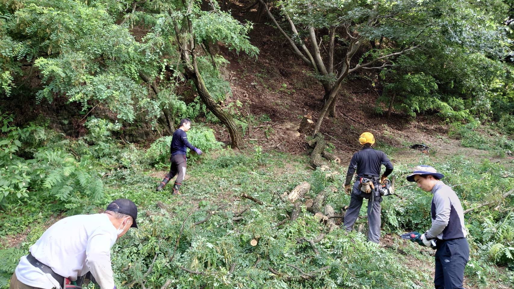 ニセアカシア伐採 2025.02.16 南側登山口のエノキに被さるように生えていたニセアカシアを伐採。 エノキは、国蝶のオオムラサキや、タマムシなどたくさんの昆虫の食草です。 成長の早いニワウルシに覆い被されてしまっていたエノキが、邪魔なニワウルシを伐採したことで日が当たるようになました。ニセアカシアやニワウルシのような増えすぎた外来種の除去は、大変な作業ですが、多様性のある里山保全のため、これからも継続して行きたいです。